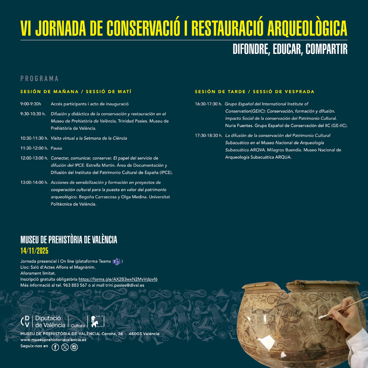 - 9:30-10:30 h.: Difusión y didáctica de la conservación y restauración en el Museu de Prehistòria de València, Trinidad Pasíes. Museu de Prehistòria de València.