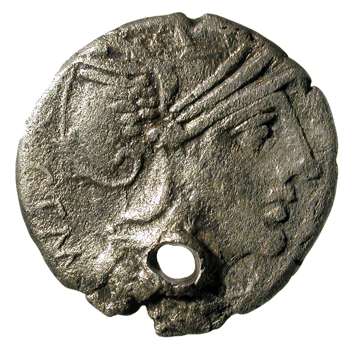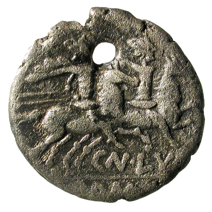 Denario hibrido. Cn. Lucretius Trio i M. Aburius Geminus. Roma. 136-132 aC. La Carència (Turís, València).