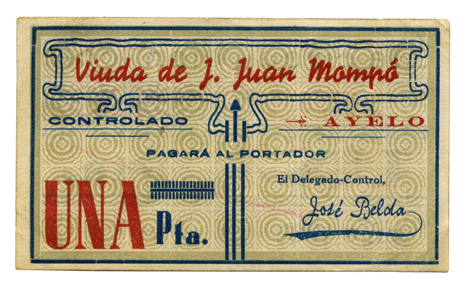 Ayelo. Viuda de J. Juan Mompó.. 1 pesseta. 1937.