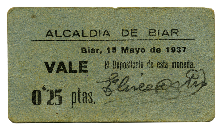 A/ ALCALDIA DE BIAR - Biar,15 de Mayo de 1937 - Vale 0'25 ptas - El Depositario de esta moneda - Signatura.