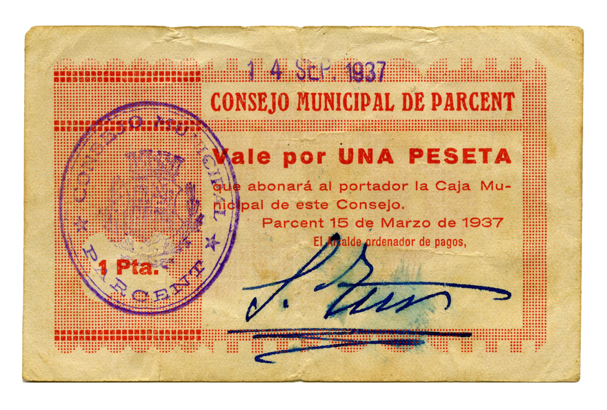 A/14 sept 1937 - CONSEJO MUNICIPAL PARCENT - Vale por UNA PESETA - que abonará al portador la caja municipal de este consejo - Parcent 15 de Marzo de 1937 - El alcalde ordenador de Pagos - Signatura.