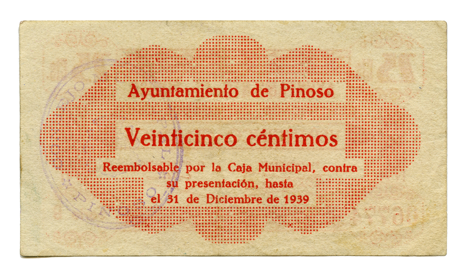 R/ Ayuntamiento de Pinoso - Veinticinco céntimos - reembolsable por la Caja Municipal, contra su presentación ,hasta el 31 de Diciembre de 1939 - Setgell ovalat de tinta morada il·legible.