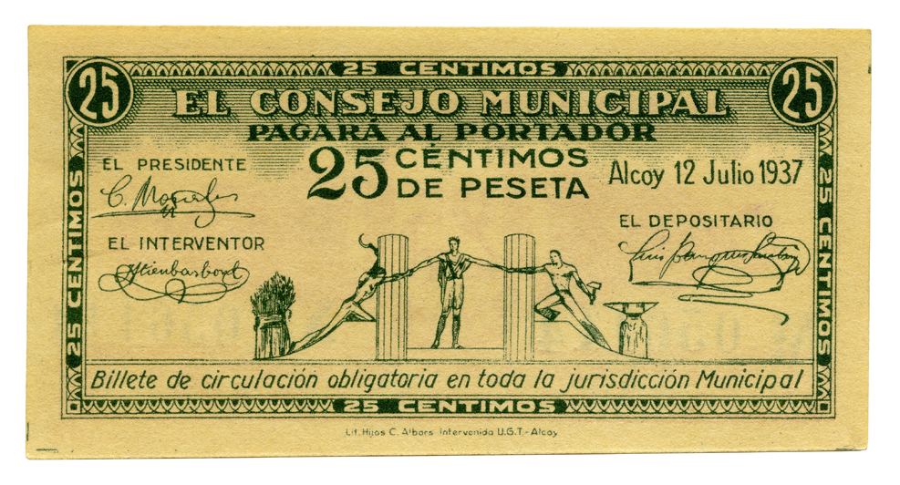 A/ 25 CENTIMOS - EL CONSEJO MUNICIPAL PAGARÁ AL PORTADOR 25 CÉNTIMOS DE PESETA - Alcoy 12 julio 1937 - Bitllet de circulació obligatòria en tota la jurisdicció municipal. Signatures: EL PRESIDENTE - EL INTERVENTOR - EL DEPOSITARIO.