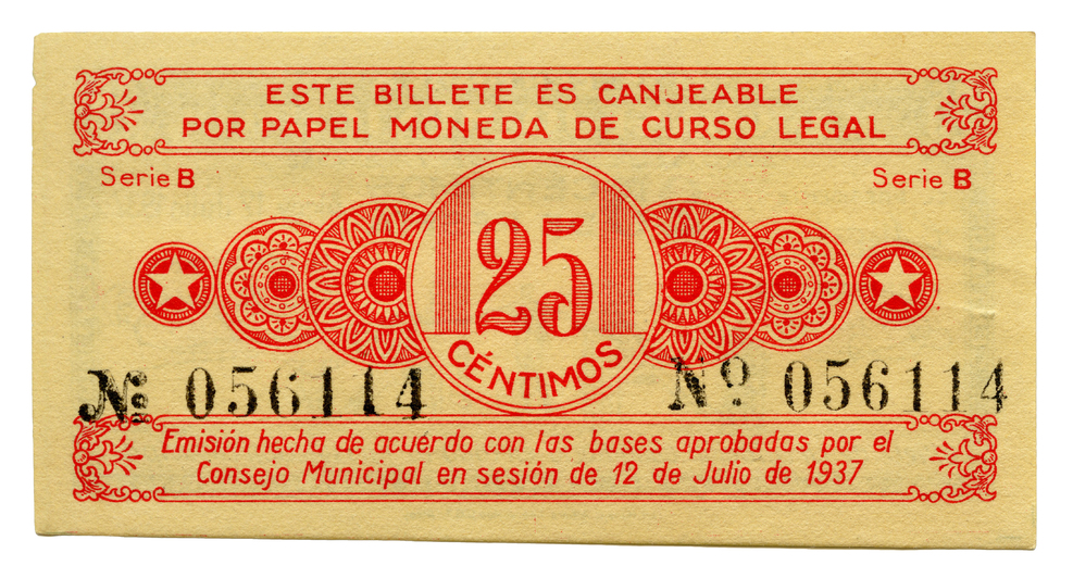 R/ 25 CÉNTIMOS - ESTE BILLETE ES CANJEABLE POR PAPEL MONEDA DE CURSO LEGAL - Emisión hecha de acuerdo con las bases aprobadas por el Consejo Municipal en sesión de 12 de julio de 1937 - Serie B. Número de sèrie 056114.