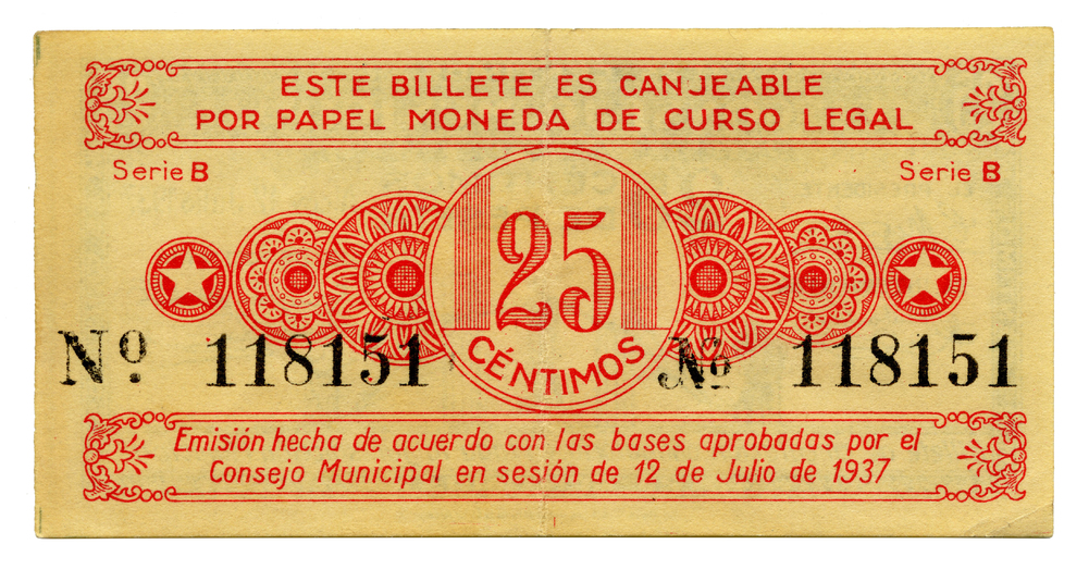 R/ 25 CÉNTIMOS - ESTE BILLETE ES CANJEABLE POR PAPEL MONEDA DE CURSO LEGAL - Emisión hecha de acuerdo con las bases aprobadas por el Consejo Municipal en sesión de 12 de julio de 1937 - Serie B. Número de sèrie 118151.