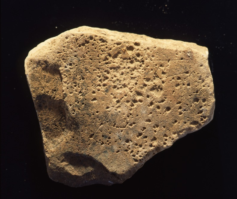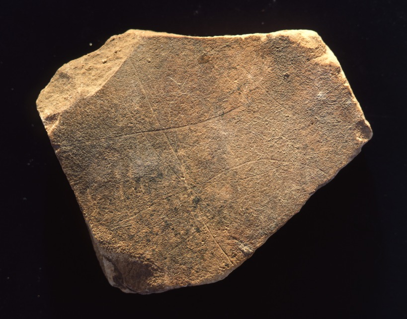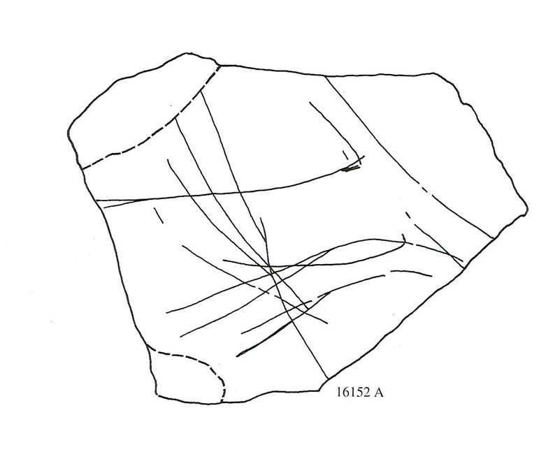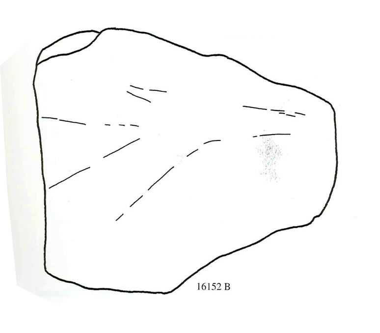 Cara B: yuxtaposición de prótomo de cérvido hembra (trazo simple) -perspectiva biangular oblicua y orejas de triple trazo lineal-, línea suelta recta y puntuación (grabado somero y pintura roja perdida).