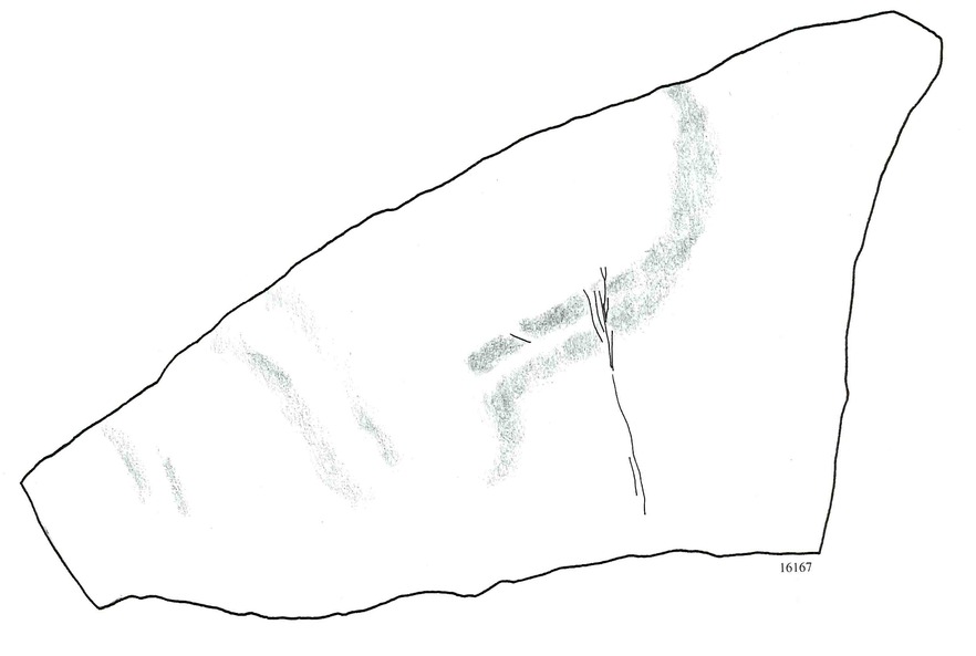 Yuxtaposición y superposición de bandas pintadas en serie irregular y líneas sueltas rectas (grabado somero y pintura roja fuerte)
