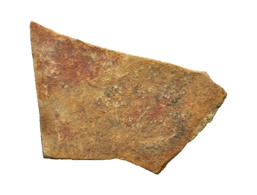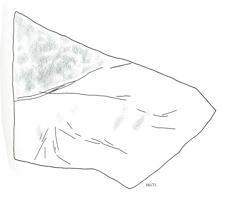 Superposición de banda de líneas paralelas incurvada, líneas sueltas rectas y curvas entrecruzadas, superficie pintada y puntuaciones (grabado muy somero y pintura roja fuerte) -tal vez parte de zoomorfo pintado y grabado-.