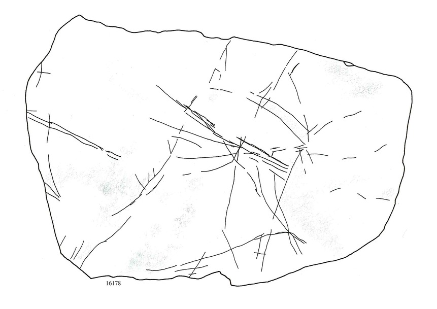 Superposición y reforzamiento de bandas de líneas paralelas en serie irregular, banda pintada, líneas sueltas rectas y curvas entrecruzadas y superficie pintada -el reforzamiento de la banda pintada y grabada similar al visto en la pieza 16170 (grabado muy somero y pintura roja perdida).