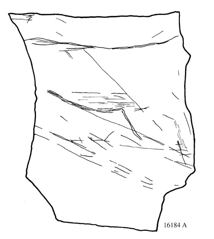 Cara A: yuxtaposición y superposición de banda de líneas paralelas y líneas sueltas rectas y curvas (grabado somero y muy somero).