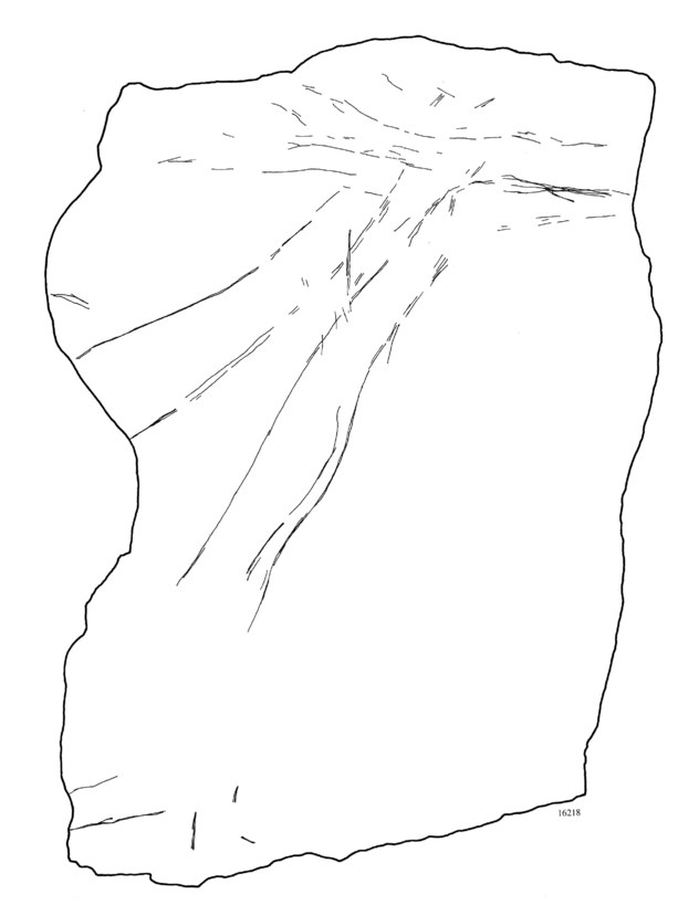 Yuxtaposición de prótomo de cérvida hembra (trazo doble) -perspectiva biangular oblicua y orejas de triple trazo naturalista- y líneas sueltas rectas y corves (grabado somero y mucho somero).