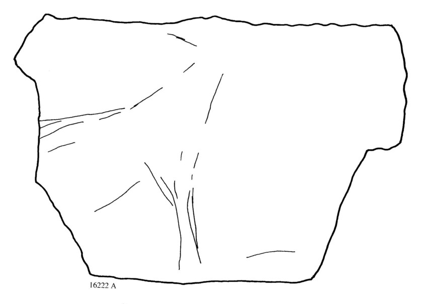 Cara A: yuxtaposición de mitad anterior de cérvido hembra clasificado con dudas (trazo doble) -en perfil absoluto y patas de líneas paralelas abiertas- y líneas sueltas rectas (grabado muy somero).