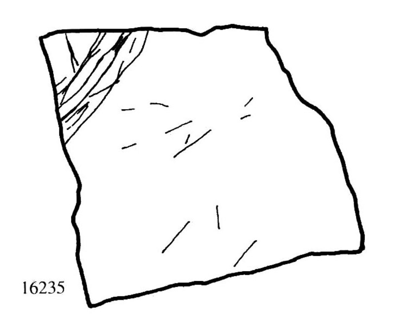 Yuxtaposición de haz de líneas entrecruzadas formando banda y líneas sueltas rectas (grabado somero).