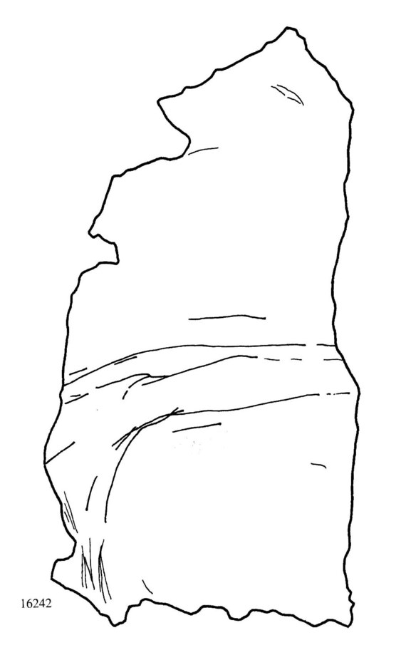 Yuxtaposición de haz de líneas paralelas formando banda incurvada, líneas sueltas rectas y puntuación (grabado somero y pintura roja perdida).
