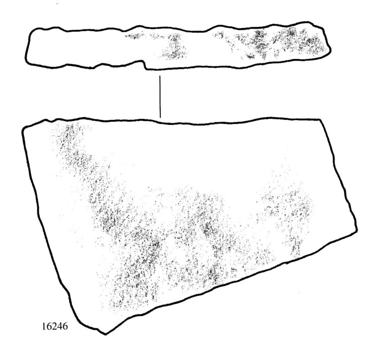 Plaqueta pintada con decoración simbólica. Cova del Parpalló (Gandia, Valencia). Solutrense medio antiguo.