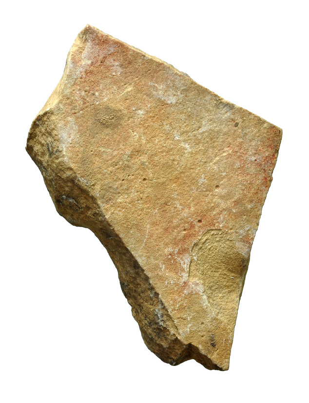 Cara B: superposición de banda de líneas paralelas incurvada y superficie pintada (grabado somero y pintura roja perdida).