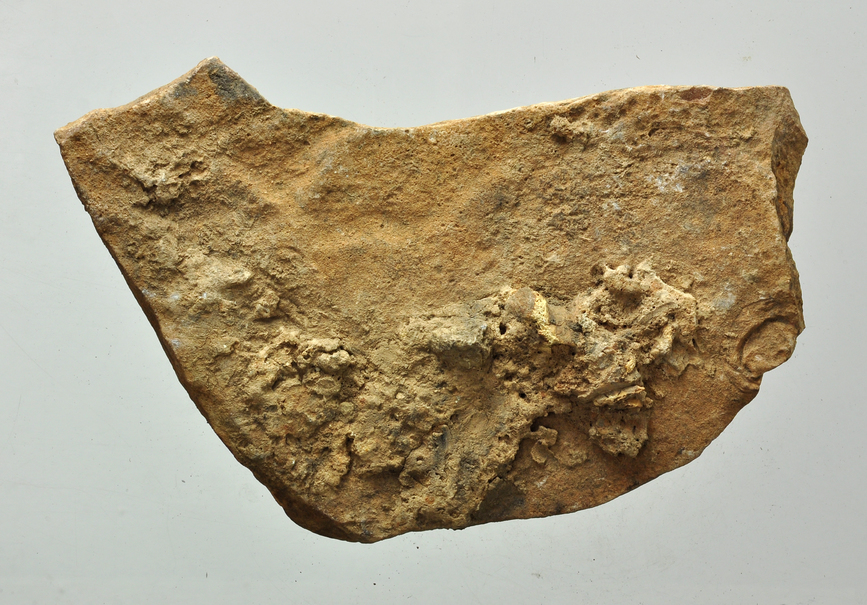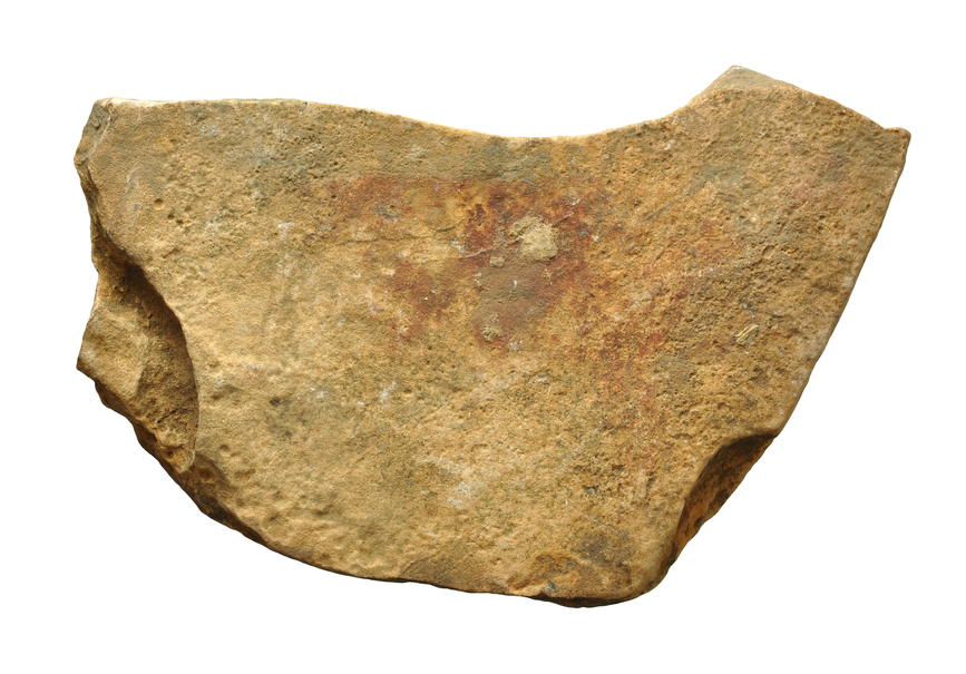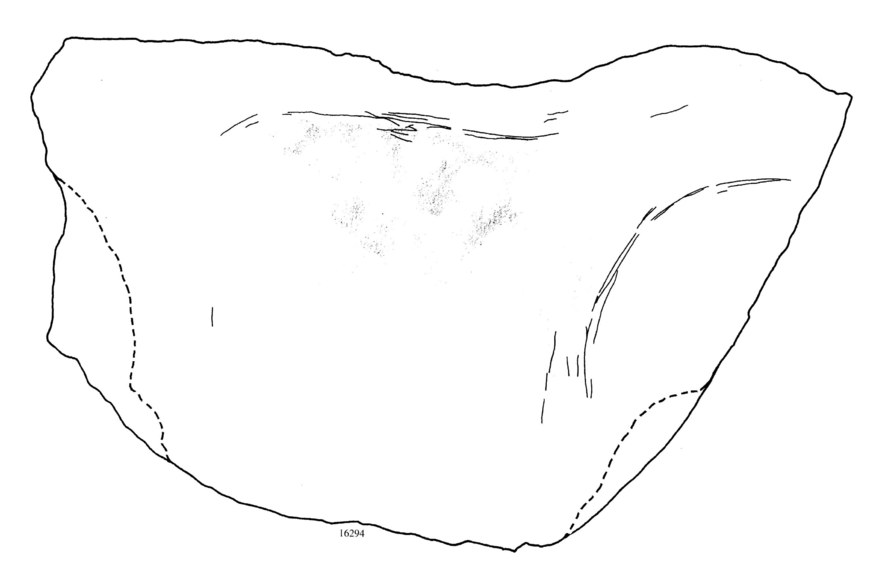 Plaqueta grabada con un animal indeterminado e incompleto y pintada. Cova del Parpalló (Gandia, Valencia). Solutrense medio antiguo.