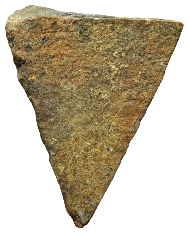 Plaqueta grabada con motivos simbólicos por las dos caras y pintada por una. Cova del Parpalló (Gandia, Valencia). Solutrense medio antiguo.