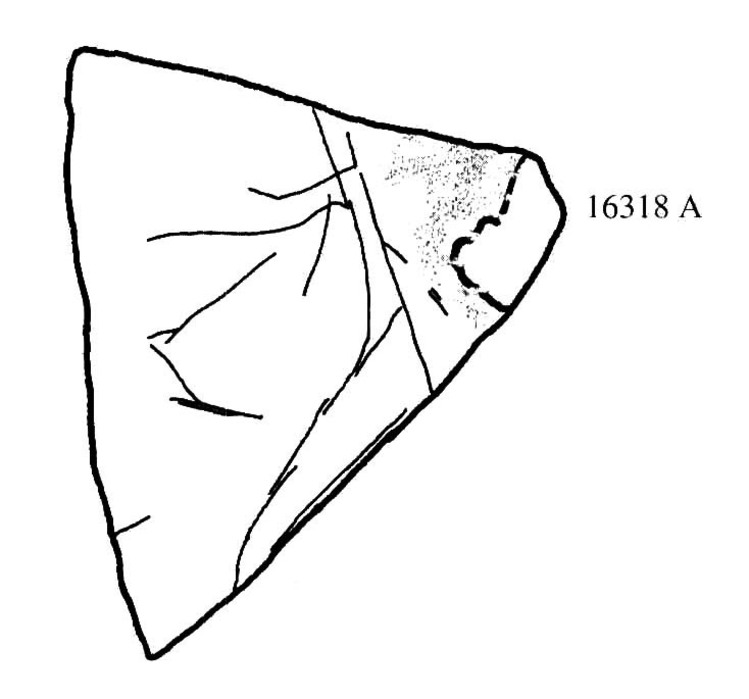 Cara A: superposición de bandas de líneas paralelas en serie irregular, líneas sueltas entrecruzadas rectas y curvas y superficie pintada (grabado somero y muy somero y pintura roja perdida).Cara B: superficie raspada (grabado muy somero).