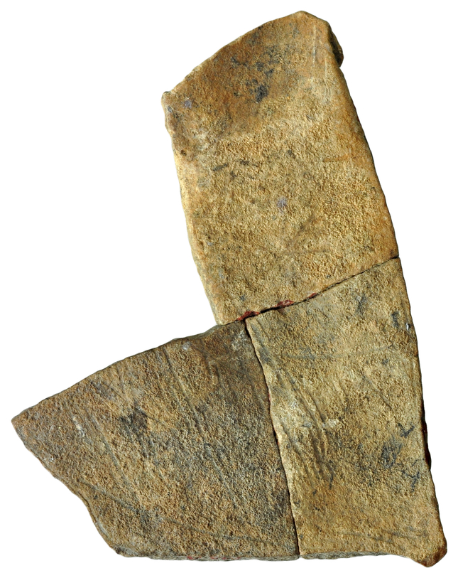 Cara A: yuxtaposición y superposición de haz de líneas paralelas incurvadas, haces de líneas paralelas formando banda en serie irregular y líneas sueltas rectas y curvas entrecruzadas (grabado somero).