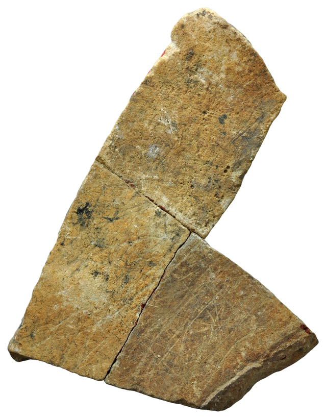 Cara B: superposición de reticulado irregular y líneas sueltas rectas entrecruzadas (grabado somero).