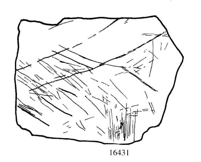 Superposición de banda de líneas paralelas, haz de líneas entrecruzadas, banda raspada y líneas sueltas rectas entrecruzadas (grabado somero y muy somero).