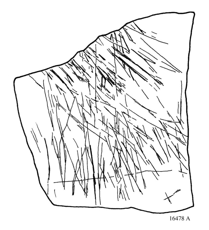 Cara A: superposición de haces de líneas entrecruzadas en serie irregular, haz de líneas paralelas y líneas sueltas rectas (grabado normal y profundo).