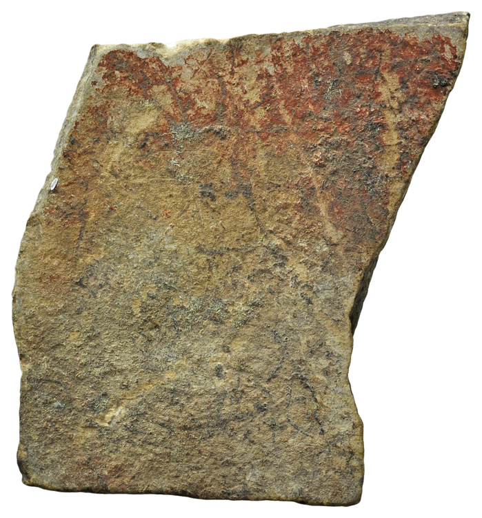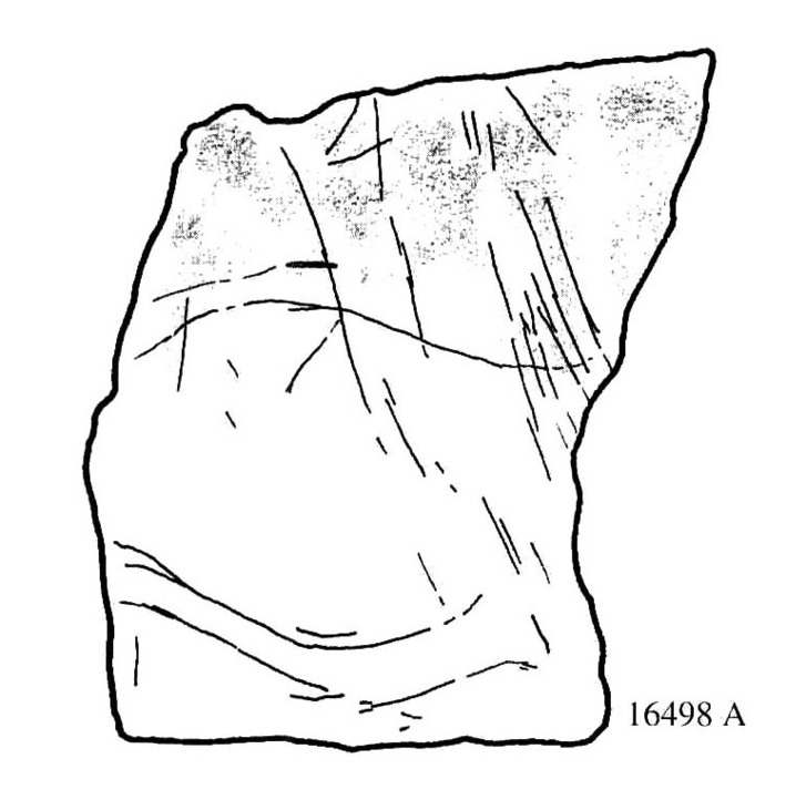 Cara A: yuxtaposición y superposición de banda de líneas paralelas incurvada, haz de líneas paralelas, líneas sueltas rectas y curvas entrecruzadas y superficie pintada (grabado somero y pintura roja fuerte).