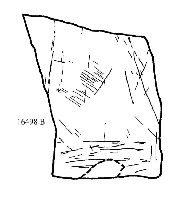 Cara B: yuxtaposición y superposición de banda de líneas paralelas incurvada, haz de líneas entrecruzadas, haz de líneas paralelas y líneas sueltas rectas (grabado somero).