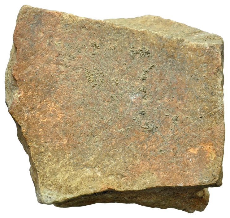 Superposición de haces de líneas entrecruzadas formando bandas en serie irregular, líneas sueltas rectas y curvas y superficie pintada (grabado somero y normal y pintura roja perdida).