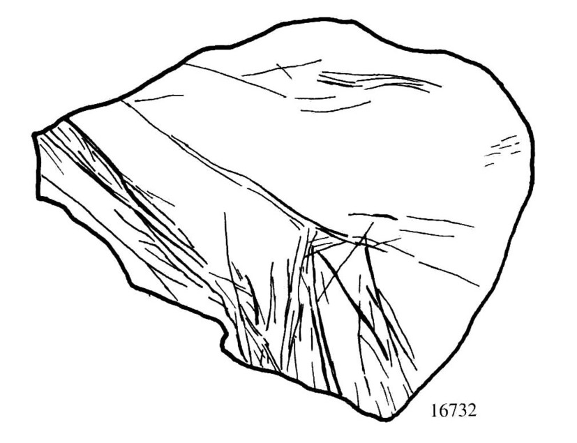 Yuxtaposición y superposición de haces de líneas entrecruzadas en serie, haz de líneas paralelas formando banda, haz de líneas paralelas formando banda incurvada y líneas sueltas rectas (probablemente parte de motivo más complejo) (grabado profundo y somero).