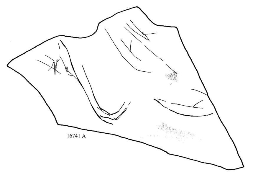 Cara A: yuxtaposición de bandas de líneas incurvadas en serie irregular, líneas sueltas rectas y superficie pintada (grabado somero y pintura roja perdida).