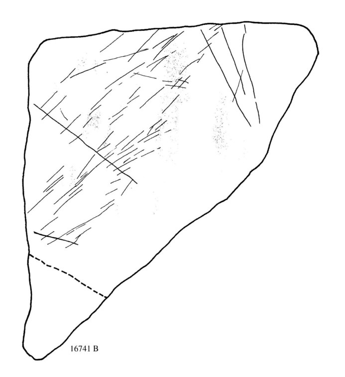 Cara B: yuxtaposición y superposición de haz de líneas paralelas formando banda, bandas de trazos cortos oblicuos irregulares en serie, líneas sueltas rectas y bandas pintadas en serie (grabado somero y pintura roja perdida).
