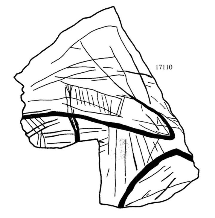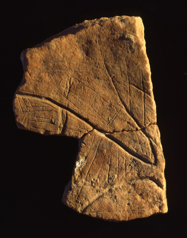 Plaqueta grabada y pintada con cáprido y motivo geométrico. Cova del Parpalló (Gandía, Valencia).