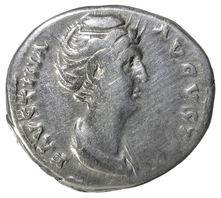 Busto drapeado de Faustina I, a la derecha; cabellos ondulados, con numerosas ondas alrededor de la cabeza y que se recogen en un moño alto, adornado con cintas de perlas.