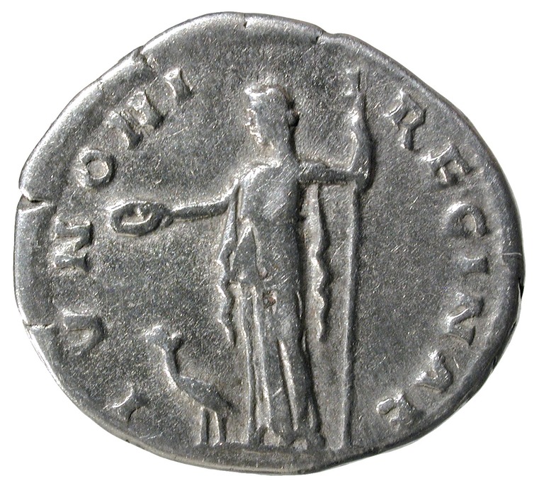 Juno, de pie hacia la izquierda, con velo, portando pátera en la mano derecha y cetro en la mano izquierda; a sus pies, pavo real.