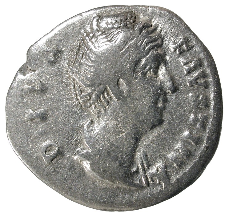 Busto drapeado de Faustina I, a la derecha; cabellos ondulados, con numerosas ondas alrededor de la cabeza y que se recogen en un moño alto, adornado con cintas de perlas.