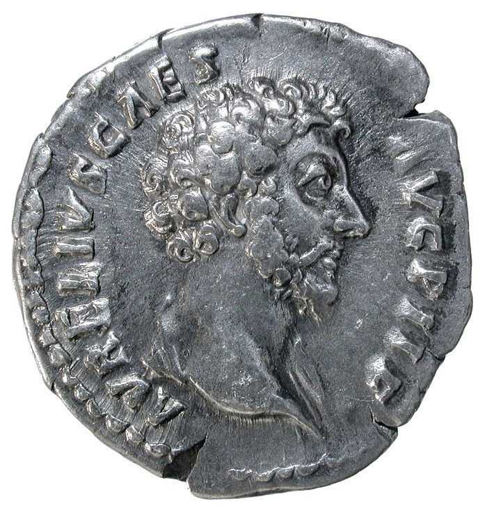 Cabeza desnuda de Marco Aurelio, a la derecha; busto drapeado.
