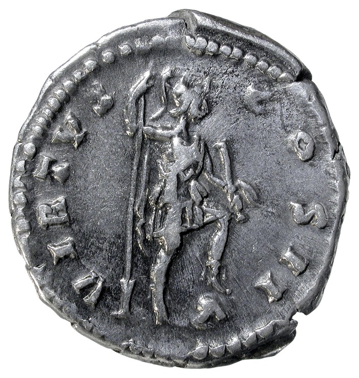 Virtud, con yelmo, de pie hacia la derecha, portando lanza en la mano derecha y parazonium en la mano izquierda; pie izquierdo sobre casco.