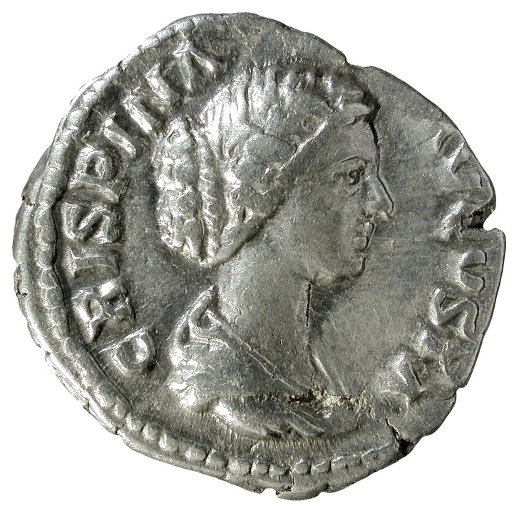 Busto drapeado de Crispina, a la derecha; cabellos elaboradamente ondulados, con numerosas ondas alrededor de la cabeza y que se recogen en la parte posterior de la cabeza.