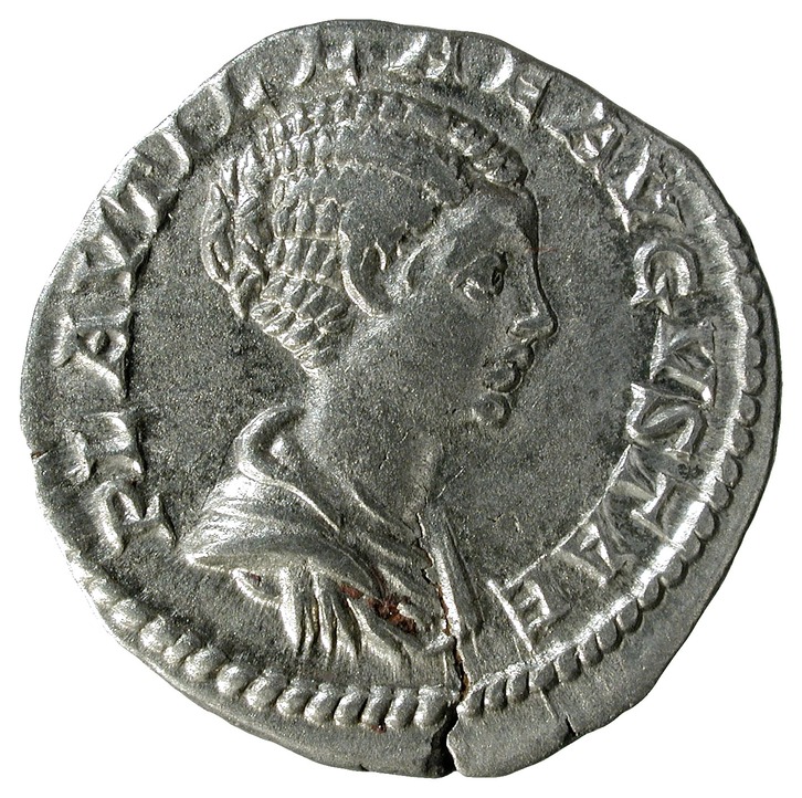 Busto drapeado de Plautilla, a la derecha; cabellos elaboradamente ondulados, formando crestas horizontales o verticales y recogidos en un moño en la parte posterior de la cabeza.