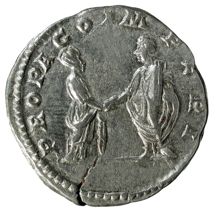 Caracalla, de pie hacia la izquierda, chocándole la mano a Plautilla, de pie hacia la derecha.