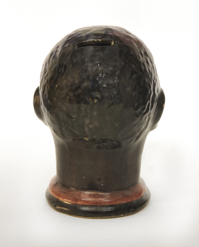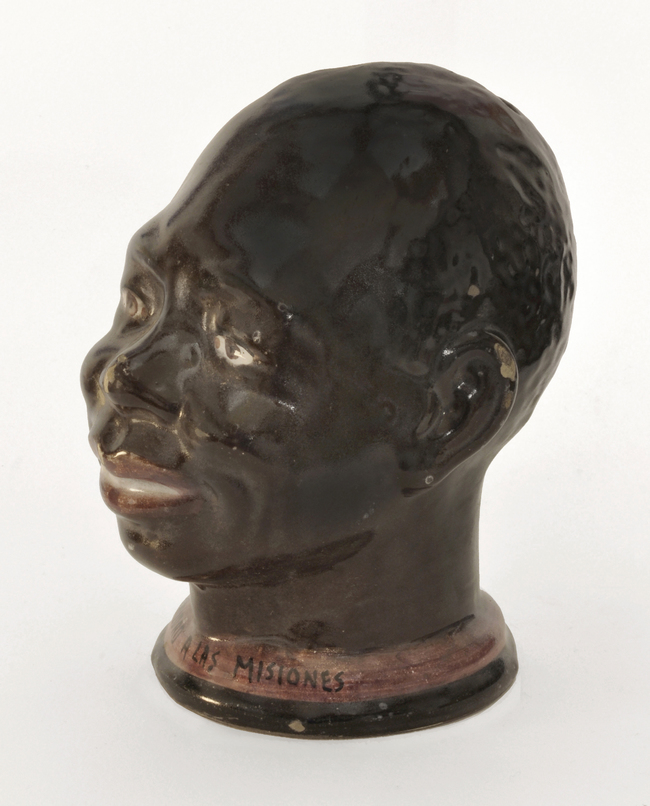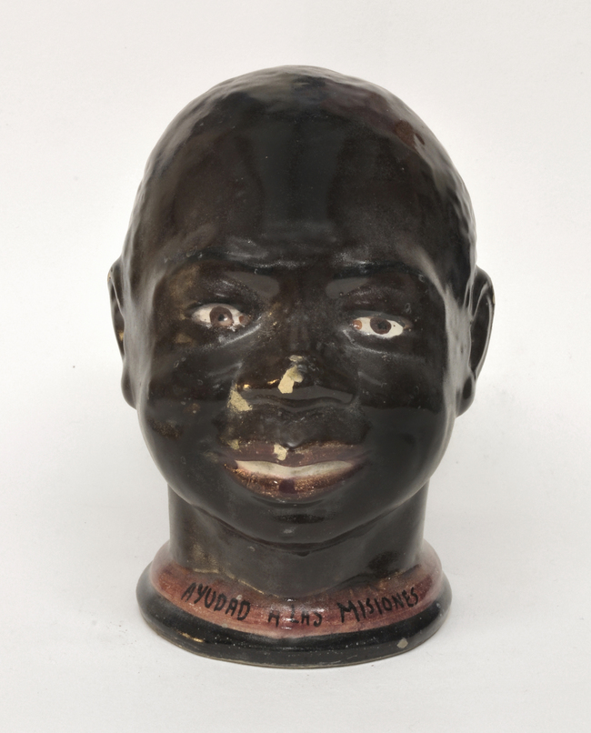Hucha de cerámica con forma de busto de africano empleada para las cuestaciones del Domund. Pintada a mano y esmaltada, con ranura para la introducción de monedas en la parte superior y abertura circular en la parte inferior para acceder al contenido con tapón de corcho (perdido). En la base texto: AYUDAD A LAS MISIONES.