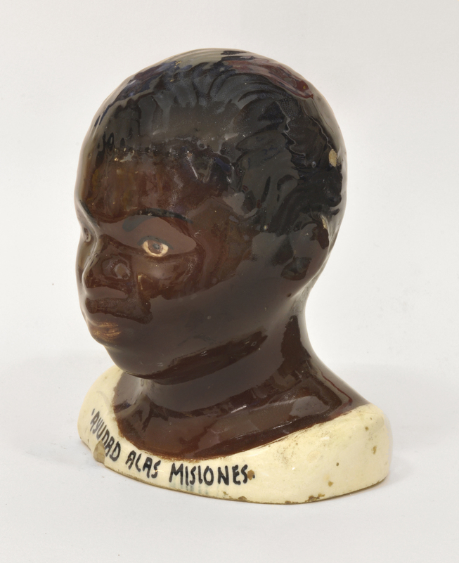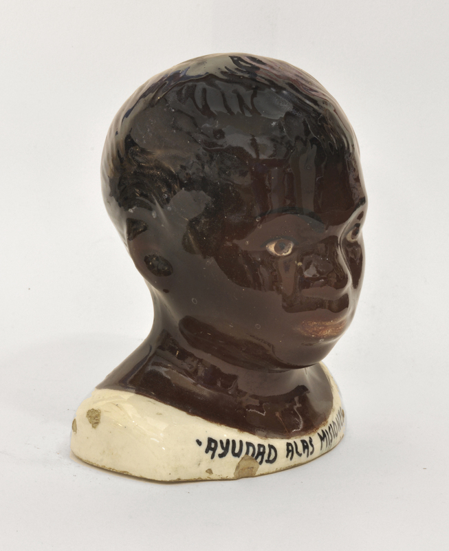 Hucha de cerámica con forma de busto de niño africano empleada para las cuestaciones del Domund. Pintada a mano y esmaltada, con ranura para la introducción de monedas en la parte superior y abertura circular en la parte inferior para acceder al contenido con tapón de corcho. En la base texto: AYUDAD A LAS MISIONES.