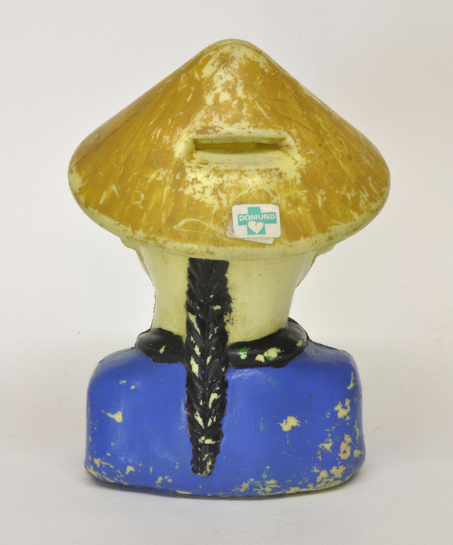Hucha de plástico con forma de busto de chino empleada para las cuestaciones del Domund. Pintada a mano, con ranura para la introducción de monedas en la parte superior y abertura circular con tapón de plástico en la parte inferior para acceder al contenido. En el sombrero conserva un adhesivo de los que se ponían a todos aquellos que realizaban donaciones.