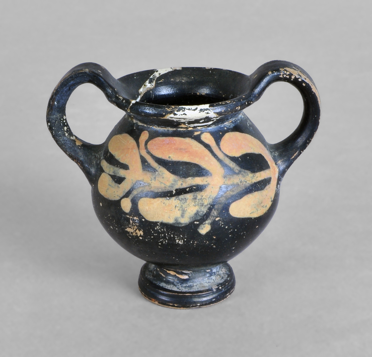 Amforisc de vernís negre amb sanefa de fulles horitzontal en la meitat superior del cos. Presenta dues anses verticals i peu motlurat. La peça està fragmentada i restaurada.