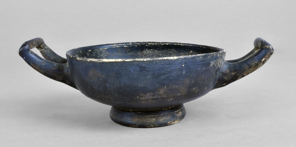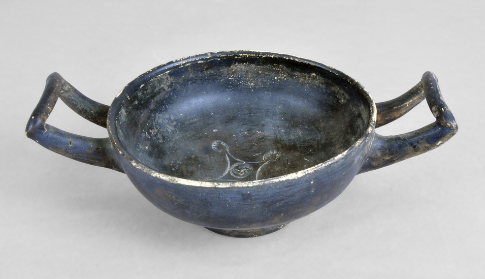 Copa de peu baix de vernís negre, de producció àtica. En el fons intern presenta quatre palmetes enllaçades i una espècie de roseta central amb tres aspes, mentre que el fons extern no està envernissat. S'hi observen incisions postcocció en la part anterior de la base.