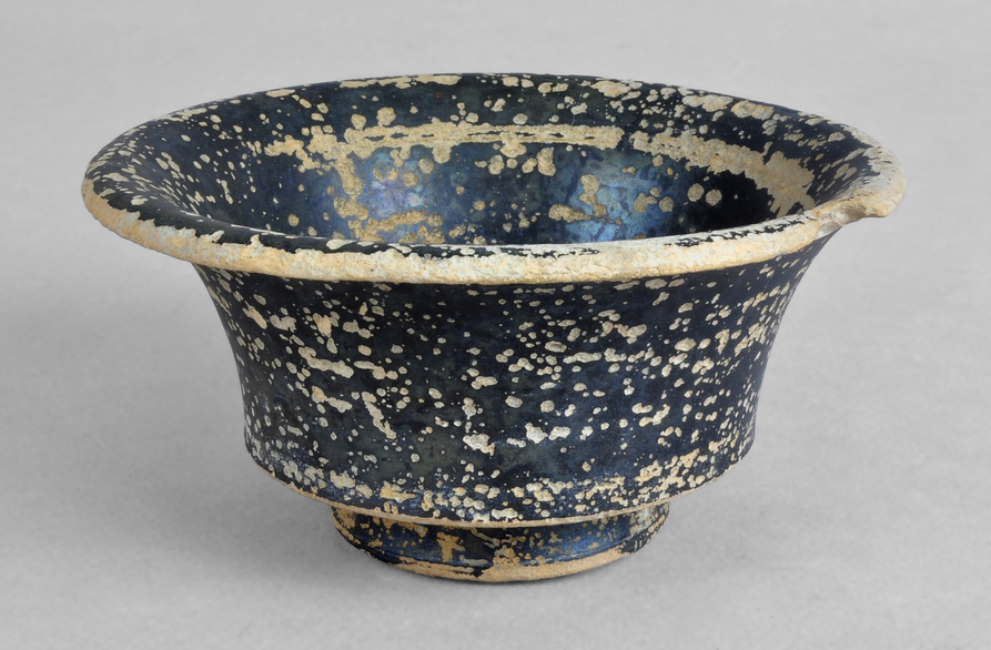 Copa de origen caleno. El barniz negro se extiende por todo el vaso excepto en el fondo externo, aunque con algún derrame en esta zona. Dicho barniz se encuentra bastante picado y presenta tonalidades metálicas en algunas zonas.