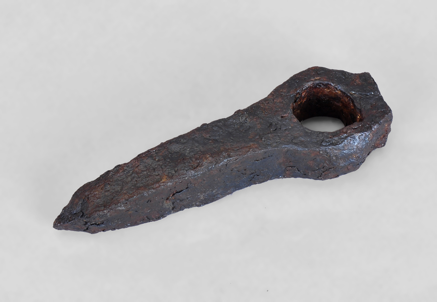 Pic-martell de ferro, amb orifici en la part distal per a emmanegar i senyals d'haver-hi rebut colps. Part central del cos de secció quadrangular.