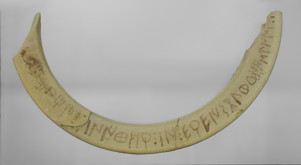 Tres fragments d'una vora de càlat amb rètol pintat en llengua ibérica i signari llevantí que es transcriu com bitinba:baniteḿbaŕ:ban:eŕeiskoltur:niśunin++[